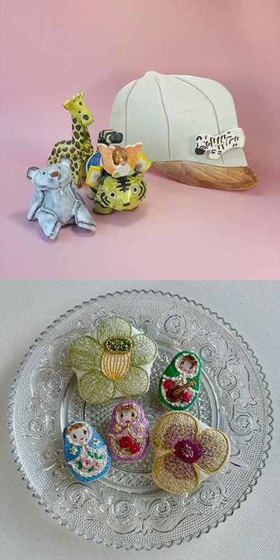 ■3月20日(金)~3月27日(金)■期間中無休■12:00~19:00 祝日・土・日・最終日12:00~17:00村田肇一アフリカ・ケニアの土でゾウやキリンを作ったのが始まり。それから50年余り経ちました。干支のどうぶつ や イヌやネコ、仲間はどんどん増え続けています。変わらないタタラ作りのどうぶつたちをご覧ください。村田雅子愛猫寝ている側で、ちくちく刺繍しています。花やマトリョシカなどをモチーフにしたブローチたちご覧いただけるとうれしいです。