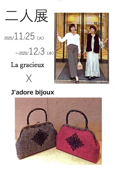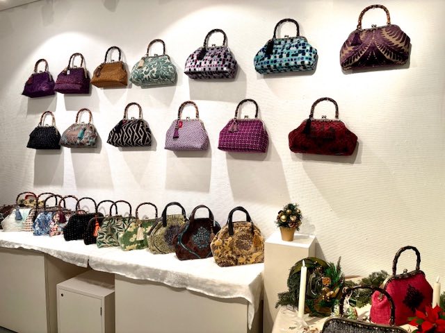 イギリスのシャネルツイードや海外の輸入ファブリック、日本の金華山織りなどを使って丁寧に仕上げました。レリーフ模様の口金には、天然石やスワロースキーを一針一針縫い付けています。新作のカラフルなバネ口バッグもオシャレですよ♪