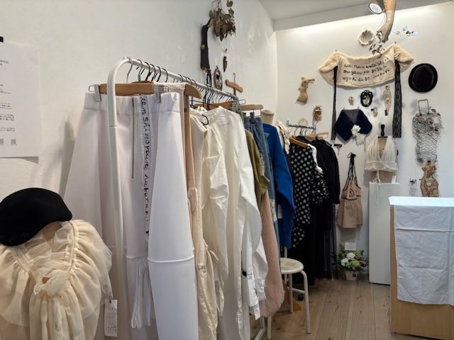 コラージュリメイク服と水晶やアンティークパーツを使ったアクセサリーの展示販売です。